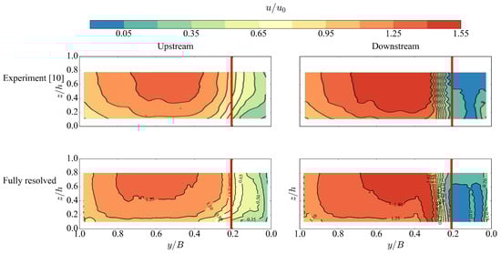 For the fully-resolved case, which serves as the baseline for the evaluation of the other two simplifications, we found that the turbulent inlet condition was critical for better comparison with the experiments in Bennett et al. []. In this study, a background case without ELJ was first run to get a fully-developed open channel flow, which was then used at the inlet. Figure 4 compares the cross-sectional distributions of mean streamwise velocity u and turbulent kinetic energy (TKE) k between the numerical and experimental results for the background case. The simulated mean fields were based on averages over 140 s, while in Bennett et al.’s [] experiment, the averaging time was 180 s. The results from the 140 s averaging time have little difference from those with 100 s averaging time. Therefore, the 140 s averaging time was used in this work. From the comparison in the figure, a similar pattern and comparable magnitude can be observed for both velocity and TKE. The velocity core is slightly stretched in the simulation than in the experiment.