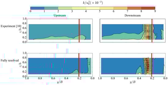 where denotes the resolved velocity fluctuation in three directions and denotes the unresolved sub-grid scale kinetic energy. The simulated upstream distribution of TKE has a noticeable difference from the experiment because of the overall small magnitude. For the downstream cross-section, the shear layer induced by ELJ created a high TKE zone, which was captured well by the computational model.