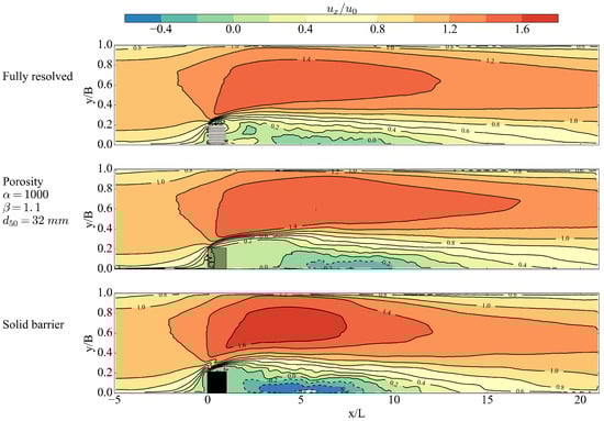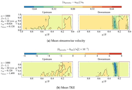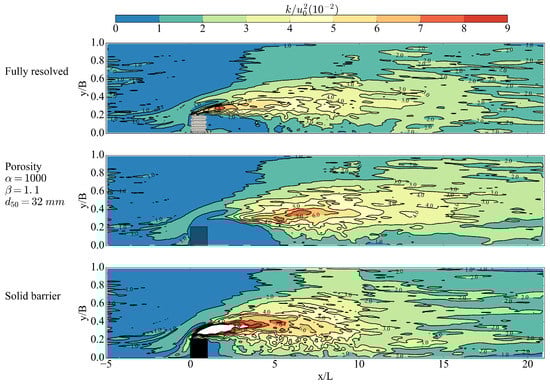 In-stream structures also affect river morphology by changing sediment transport. Thus, near-bed turbulence, the driver of sediment motion, is evaluated. The time-averaged TKE near the bed is used as a proxy for sediment entrainment capacity []. The near-bed TKE distributions are plotted in Figure 12. The data were sampled at a height of 15 mm above the bed. From the comparison, it is observed that the porosity model gave a better match with the fully-resolved case. The porosity model underestimated TKE in the shear layer, and the shear layer itself was delayed. The solid barrier case greatly overestimated TKE in the shear layer. Thus, from the sediment transport point of view, the solid barrier approximation to the ELJ will over-predict the scour hole around the structure.