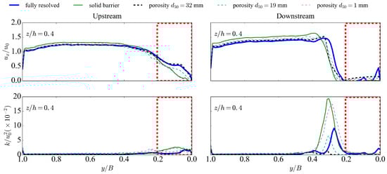 To quantify the difference between the porosity cases and the fully-resolved case, the cross-sectional error distributions for mean velocity and mean TKE are plotted in Figure 7. The error is defined as the porous media model results minus the fully-resolved simulation values. Figure 8 shows the transverse distribution of mean streamwise velocity and TKE on the upstream and downstream cross-sections at . To reduce the length of this paper, we only plot the results from the case of and , which gives better results than the case of and . The red dashed rectangle represents the location of ELJ. As shown in Figure 7a and Figure 8, for the upstream cross-section, large velocity errors mainly occur near the bed for small . When is small (1 mm), the porosity model underestimates the streamwise velocity at the upstream side of ELJ, which is caused by the lower permeability suppressing the flow. The velocity suppression is more significant near the bank and free surface. In contrast, larger leads to higher permeability and thus overestimates the streamwise velocity in the upstream side of ELJ. For the downstream cross-sections, error occurs mainly in the shear layer. All porosity model cases underestimate the streamwise velocity in the shear layer, with slight overestimation in the near bed region. This near-bed overestimation is less significant when has the value of the key element diameter. For the TKE distribution shown in Figure 7b and Figure 8, the error distribution is different from velocity. With 32 mm and 19 mm, TKE was under-predicted in the shear layer. However, if is very small (1 mm), TKE was dramatically over-predicted in the shear layer. This is caused by the fact that lower permeability of the porous media region forces more flow to the main channel and generates a larger velocity gradient in the shear layer.