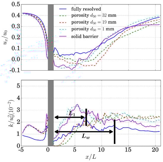 Chen et al. [] measured the centerline velocity at half depth in flume experiments to represent the depth-averaged velocity for their unbounded flow around a porous vegetation patch. In this study, since we have the simulated velocity distribution around ELJ, local cross-sectional averaging was performed within the adjustment and wake regions. Local regional averaging is more suitable for this semi-bounded flow. Figure 10 shows the longitudinal profiles of cross-sectionally-averaged streamwise velocity and TKE within the adjustment and wake regions. For the velocity profile, due to the semi-boundedness (wall effect), the incoming normalized streamwise velocity is only about 0.43. The trend of the velocity profiles is in accordance with that in Chen et al. []. In the steady wake region, the larger pore size () case tends to match better with the fully-resolved case. The velocity profiles of solid barrier and small pore size case are similar, which makes sense because the small pore size reduces the permeability. They both show negative streamwise velocity inside the steady wake region. This is induced by the strong boundary layer separation and vortex generated at the edge of the object. With the increase of porosity, more passing-through flow reduces the negative pressure gradient, pushes the wake flow further downstream and thus enlarges the wake. For TKE, it has a relatively large value at the upstream side of ELJ edge and a small value at the immediate downstream side where the area is shielded. After that, TKE increases rapidly in the steady wake region. We also found that the growth rate and asymptotic TKE value are affected by the permeability and the resulted flow passing through ELJ. Reduced pass-through flow will induce higher shear, more eddies and, thus, higher TKE in the steady wake region. Neither the porosity model cases, nor the solid barrier case reproduced a good match on TKE in the whole of the wake zones. The porosity model with a large pore size matched with the fully-resolved case in the steady wake zone, while the solid barrier case matched better further downstream. For all porosity model cases, they tend to maintain high turbulence even after the steady wake region.