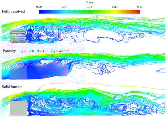 The effects of ELJ representation in models can be evaluated at the simulated flow features. Figure 13 shows an instantaneous flow field (streamlines) in the wake zone, which is colored by the magnitude of instantaneous velocity. These streamlines were sourced from a horizontal line parallel to the downstream side of ELJ. The source line was located at 50 mm above the bed. As can be seen in the figure, significant discrepancy exists in the steady wake zone in different model representations. For the fully-resolved case, small and irregular flow curvatures can be observed in the steady wake zone, most of which stem from the element surface in ELJ. The incoming flow has to go through the irregular pores within ELJ, and it results in very rich flow dynamics. In the porous media case, such dynamics are totally lost, and the streamlines are much smoother than the other two cases in the steady wake zone. Low permeability in the porous media region only slows down the flow through ELJ. The only similarity between the porous media case and the fully-resolved case is that the passing-through flow causes the delay of the shear layer. In the solid barrier case, a larger recirculation zone and a strong shear layer can be seen at the lee side of the block.