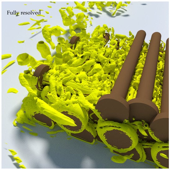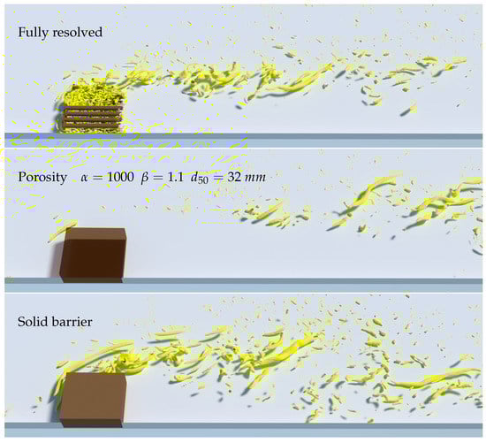Figure 14 shows the instantaneous isosurfaces of = 3. is a commonly-used flow quantity to visualize the vortex structures []. Substantial differences can be observed among the three cases. The fully-resolved case shows strong coherent flow structures inside the ELJ, also shown in Figure 15. In the shear layer, it takes a long distance for the vortex to shed behind the ELJ to re-attach to the right bank. However, in the porous media case, no such coherent structure was observed inside the porous media domain at the same value of . The vortex structure is also extremely weak in the near-field compared with the fully-resolved case. However, it shows similar vortex structure in the far-field as the fully-resolved case. In the solid barrier case, the contour of = 3 shows comparable strong coherent structures as the fully-resolved case in the near-field shear layer. However, the shear layer of the solid barrier case is more diffusive in the far field than the other two cases. In addition, the reattachment distance is much smaller in the solid barrier case. This reduction of reattachment distance is caused by the lack of passing-through flow in the solid barrier case. Overall, in terms of flow structure, the porous media case models well in the far field, while the solid barrier case predicts better in the near field. Nevertheless, neither of them are able to resolve the flow structure inside the ELJ.