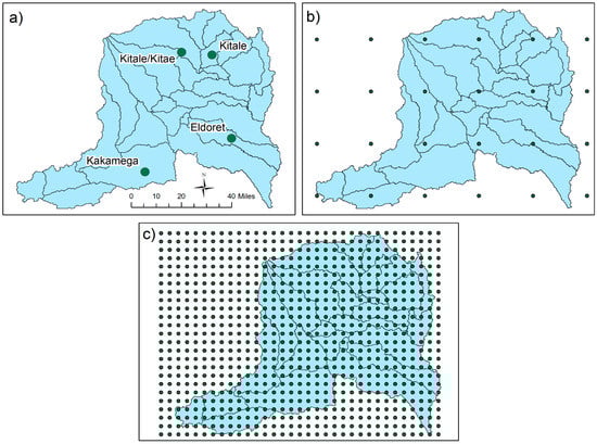 Comparison of the spatial resolution of the varying precipitation inputs to the SWAT model: (a) station precipitation dataset from the University of California Santa Barbara (UCSB); (b) CFSR station dataset from the National Centers for Environmental Prediction (NCEP); (c) CHIRPS dataset from UCSB Climate Hazards Group (CHG) after MATLAB conversion from .tiff to “stations”.