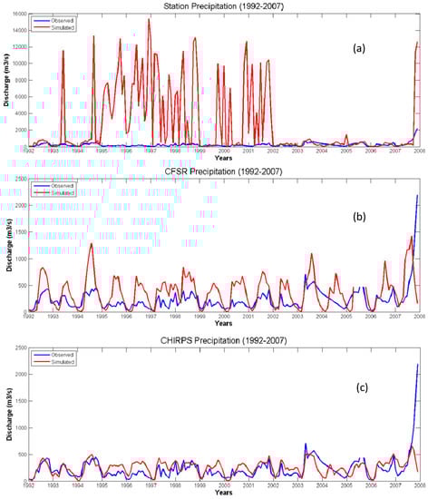 Uncalibrated comparison of observed and simulated monthly streamflows from the Nzoia at the Ruambwa Ferry discharge station from 1992 to 2007: (a) station precipitation dataset; (b) CFSR station dataset; (c) CHIRPS dataset.