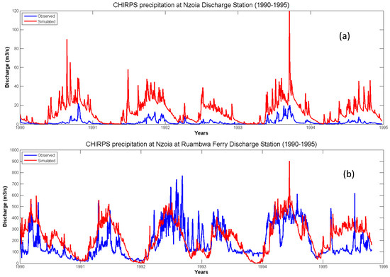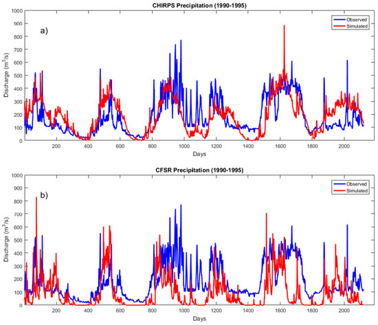 Calibrated comparison of observed and simulated daily streamflows from the Nzoia at Ruambwa Ferry discharge station from 1990 to 1995: (a) CHIRPS precipitation dataset and (b) CFSR station dataset.