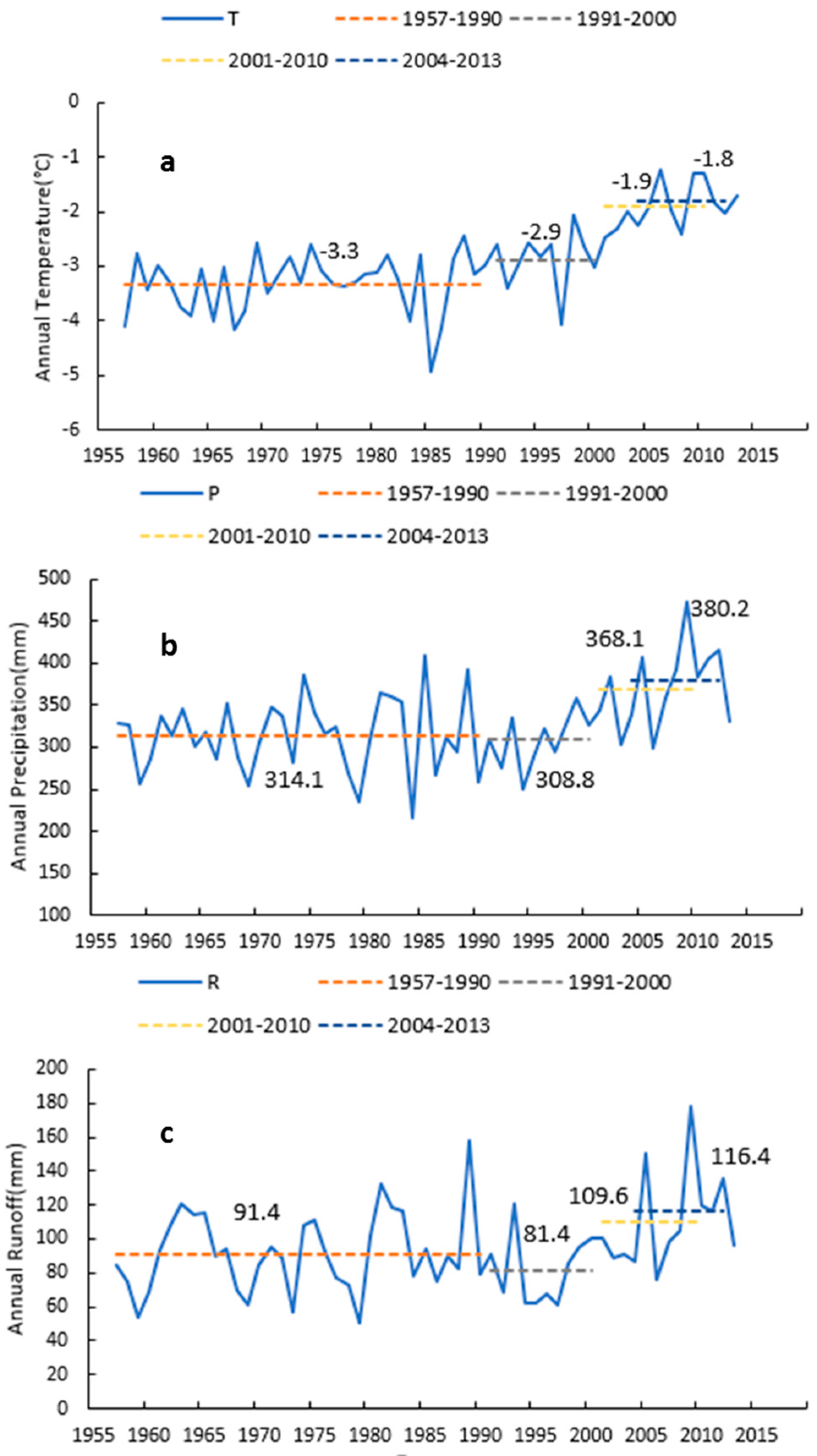 - The temperature in the SRYR increased at a rate of 0.34 °C/decade, and the precipitation and evaporation also increased by 11.4 and 7.6 mm/decade, respectively. The runoff depth increased by 3.3 mm/decade;
