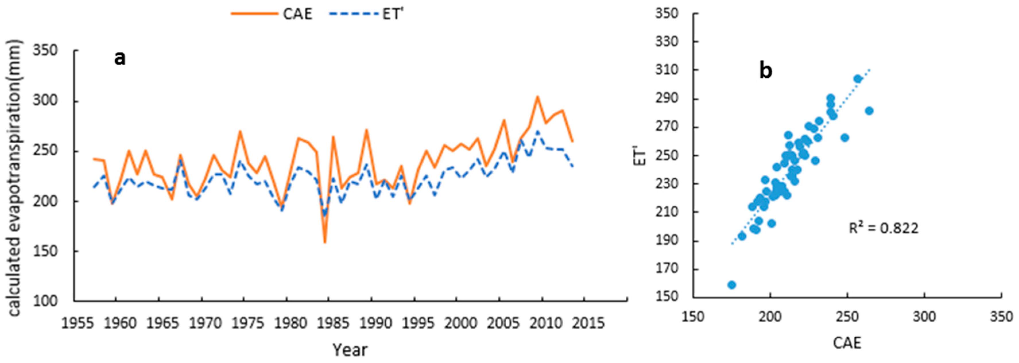 - Takahashi, K.; Wang, C.G. The projection formula for evapotranspiration from the monthly mean temperatureand monthly precipitation. Meteorol. Sci. Technol. 1979, 26, 29–32. (In Chinese) [Google Scholar]