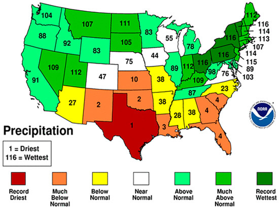- NOAA (National Oceanic and Atmospheric Administration). National Temperature and Precipitation Maps, 2016. Available online: https://www.ncdc.noaa.gov/monitoring-content/sotc/national/statewidepcpnrank/statewidepcpnrank-201010-201109.gif (accessed on 19 July 2016).