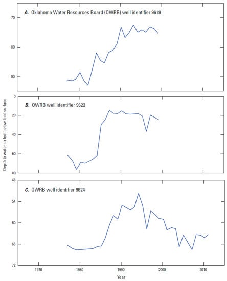Water levels from Oklahoma Water Resources Board (OWRB) Mass Measurement Program wells. Source: Mashburn et al. [27]. (A) Well 9619, (B) Well 9622, (C) Well 9624.