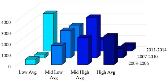 The model utilizes the US Geological Survey (USGS) water database containing 20,162 wells in Oklahoma and a database from Texas Water Development Board on ~140,000 monitored water wells in Texas. Due to data disparities and missing data points for all wells, we ‘cleaned’ the data set by determining selection criteria for each well to be included in the model, as follows: (a) wells sampled at least once in each of the three time sections: 2003–2006, 2007–2010, 2011–2014; and (b) wells with at least five samples minimum in the entire time frame. In this way, we specified 7211 water wells in Texas and 390 water wells in Oklahoma. The data was further normalized in order to provide a data-based benchmark and comparison basis for all groundwater data entries. Normalization of the groundwater well levels in both states was conducted for each well separately in two steps. First, minimum and maximum values in the entire raw data set were determined and averaged. In order to provide a more detailed distribution and precise analysis, the sampled values that fell between the minimum and the average value were averaged, thus generating the low-average value. Similarly, the sampled values that were observed between the maximum and the average value were averaged, thus generating the high-average value. This specification provided five hard values (minimum, low-average, average, high-average, and maximum) and categories to constitute a histogram with four bins that were further used to determine distribution of groundwater well levels over time (Figure 5 and Figure 6).