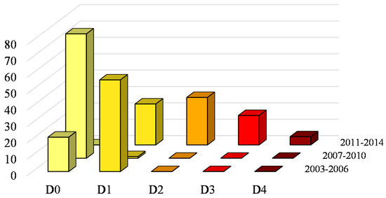 Data from the Drought Monitor was evaluated for each week in the entire analyzed time period of 2003–2014. A total of 206,544 samples for all counties in Texas and Oklahoma were used for the analysis. The samples represent drought indexes [D0—abnormally dry, D1—moderate drought, D2—severe drought, D3—extreme drought, and D4—exceptional drought] reflecting the percent of the county in each of the drought conditions, respectively (compare with Figure 2). It needs to be mentioned that the presented categorization of groundwater levels (Figure 5 and Figure 6) and drought severity (Figure 7 and Figure 8) has low regional granularity, as it refers to the entire state of Oklahoma and Texas, respectively. The following geospatial distribution offers a more accurate picture of given conditions at a very detailed scale of specific groundwater wells or at the county level. Moreover, a follow-up analysis resonating from this research will allow us to evaluate these correlations for each climate region in both states.