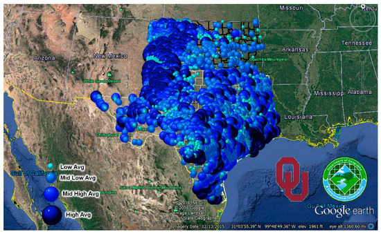 In a next step, we used the C++ language to develop computer code and generate KML (Keyhole Markup Language) data files that allow model users to interact with the results both in Google Earth or Cesium and Google Maps (or other platforms) [41]. The model shows three categories of regional trends and variations in groundwater well depletion over the analyzed time span: increasing, decreasing, and inconclusive trends (no change in water levels) in different regions of Oklahoma and Texas. The trends indicate regions of current water scarcity and potential limited water availability in the future.