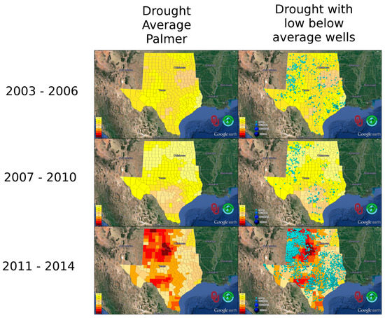 To validate the model results visually, the Palmer Drought Severity Index was applied at this stage as a correlation variable for each county in Oklahoma and Texas. The results of the Palmer Drought Severity Index representation visibly show drought severity in 2011–2014 and weather variations in the three analyzed time spans (compare with Figure 2). By overlapping the PDSI gradient map with the interactive 4D groundwater well model a distinct visual correlation of those two variables unfolds. Figure 11 represents the PDSI gradient in Oklahoma and Texas and also a selection of wells with the lowest water levels in the analyzed time period. It clearly shows that in 2003–2006 the Palmer Drought Severity Index gradient indicated mostly abnormally dry conditions in both states, while the groundwater model shows a low number of wells with the lowest water levels. In 2007–2010, the Palmer Drought Severity Index showed a change in drought severity to moderate drought in some regions, while the number of wells with the lowest water levels either did not change in some regions or increased in regions shadowed with the light orange color (moderate drought according to PDSI). A statistical breakthrough is visualized in the last time period of 2011–2014, with PDSI indicating exceptional and extreme drought in many Oklahoma and Texas regions. At the same time, the number of wells with the lowest water levels spiked markedly. The correlation of the groundwater well model with the independently calculated Palmer Drought Severity Index is a strong indicator of the methodological robustness and validity of our model. While this model is a visual representation of groundwater level changes over the time span of 12 years, it was not the goal of this study to present differences in aquifer storage coefficients across monitored regions or the relationship between water extraction and changes in groundwater levels.