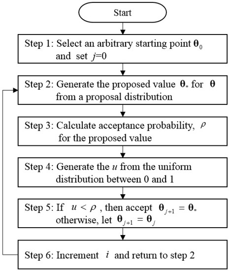 The Metropolis–Hastings algorithm [47] is the one of most popular algorithm for obtaining a sequence of random samples from a probability distribution for which direct sampling is difficult [48,49,50]. This algorithm simulates the Markov chains in the Monte Carlo integration to generate a set of samples whose distribution converges to a posterior distribution. The Metropolis–Hastings algorithm works by generating a sequence of values in such a way that the distribution of the values more closely approximates the desired distribution. These sample values are produced iteratively with the distribution of the next sample being dependent only on the current sample value. After the iterative sampling process, this algorithm selects a candidate for the next sample value based on the current sample value. Finally, the candidate is either accepted or rejected using the acceptance probability. Hence, the reasonable acceptance probability is most important to draw the desirable random samples. The acceptance probability can be expressed using Equation (9).