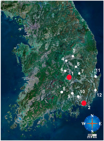 Location of 2 target rainfall gauges and 10 additional rainfall gauges. Target rainfall gauges (red): 1–Daegu; and 2–Busan. Additional rainfall gauges: 3–Yeongju; 4–Mungyeong; 5–Uiseong; 6–Gumi; 7–Yeongcheon; 8–Geochang; 9–Hapcheon; 10–Milyang; 11-Pohang; and 12–Ulsan.