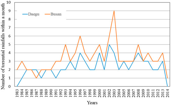 Figure 2 shows the location of the two target rain gauges (red colored) and the 10 additional rain gauges (white colored). Table 1 lists the detailed information of the 12 rain gauges and the descriptive statistics of the rainfall data during the 32 years (1983–2014). In addition, Figure 3 shows the trend of the number of torrential rainfall events within a month at the Daegu and the Busan rain gauges. In Figure 3, it is suggested that the number of torrential rainfall events within a month were increased after 1994 and 1993 at the Daegu and the Busan rain gauges, respectively.