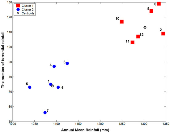 Before the elicitation of an informative prior distribution by empirical Bayes method, the homogeneity of the selected rain gauges should be checked. The cluster analysis can be used to identify the homogenous group. Goyal and Gupta [60] identified homogenous rainfall regimes in the Northeast region of India using the fuzzy cluster analysis. When the data sets of the rainfall from a specific gauge are homogeneous to the rainfall datasets from other gauges, the data from the other gauges can be used to elicit the prior distribution under ergodic assumption. The ergodic assumption means that time average of a time series is the same as its spatial average. In this study, the cluster analysis using Matlab (Matrix laboratory, R2010a, MathWorks) was performed. Matlab cluster toolbox provides the two types of cluster analysis methods, K-means and hierarchical clustering. Among these, only K-means clustering was performed to group the homogeneous gauges. The objective of the cluster analysis is to find the linear combinations of a set of variables such that a few components that describe most of the variability of the original set are obtained. In this study, the annual mean rainfall and the number of torrential rainfalls at 12 rain gauges, given in Table 1, were used as variables for the cluster analysis. Although the location or elevation information can be used as another variables for cluster analysis, these variables were excluded in the cluster analysis because the homogeneity on the annual mean rainfall and the number of torrential rainfalls was important to elicit the informative prior distribution. Figure 4 shows the results of the clustering analysis using the k-means algorithm. Among the 12 rain gauges, Daegu, Yeongju, Mungyeong, Uiseong, Gumi, and Yeongcheon rain gauges were considered one group and Busan, Geochang, Hapcheon, Miryang, Pohang, and Ulsan rain gauges were considered the other.