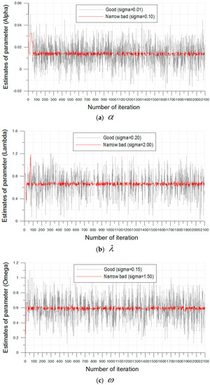 In addition, the tuning of parameters in the selected proposal distribution is important to generate well mixed results. There are two types of approaches: manual tuning through trial-and-error and automatic tuning through some optimization techniques. The automatic tuning approach is called as adaptive MCMC. In the case of the high dimensions, the adaptive MCMC, which asks the computer automatically, can be used. This adaptive MCMC scheme has been applied in a variety of studies [53,54,55]. However, if the dimensions of parameters are low, the tuning of parameters in the selected proposal distribution can be performed by manual tuning.