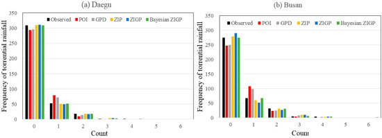 In the Busan rain gauge, the results obtained using the POI and GPD models were the same as those of the Daegu rain gauge. However, the results obtained using the ZIGP model were different from those in the Daegu rain gauge. In Table 9 and Figure 6, it was shown that the ZIGP model overestimated the number of torrential rainfalls at Count 0 and underestimated at Count 1. These conflicting results of the Daegu rain gauge were due to the estimation method used in the ZIGP model. Angers and Biswas [24] argued that the classical statistical inference procedures, such as the MLE and large sample approximation of a confidence interval, were not always suitable to make inferences of the parameters in the ZIGP model. In addition, the advantages of Bayesian approach were reported by many manuscripts in the field of statistical hydrology [34,35,38,62,63]. Hence, it was concluded that the ZIGP model used for the estimation of the number of torrential rainfall data might not always provide accurate results. However, the Bayesian ZIGP model fitted the observed data on all counts except Counts 1 and 3 at Daegu rain gauge and Counts 2 and 3 at Busan rain gauge. In particular, only the Bayesian ZIGP model simulated the number of torrential rainfall occurrence at Count 6 accurately. Hence, in the Daegu and the Busan rain gauges, the results of the Bayesian ZIGP model with the informative prior distribution were the best. Moreover, the results obtained using the ZIP model were similar to those obtained using the Bayesian ZIGP model. Hence, it was concluded that the Bayesian ZIGP model could be a reasonable choice to analyze the number of torrential rainfall data. In addition, the ZIP model could be recommended as an alternative choice from the viewpoint of practicality because the procedure of the Bayesian ZIGP model using an informative prior distribution was complex.