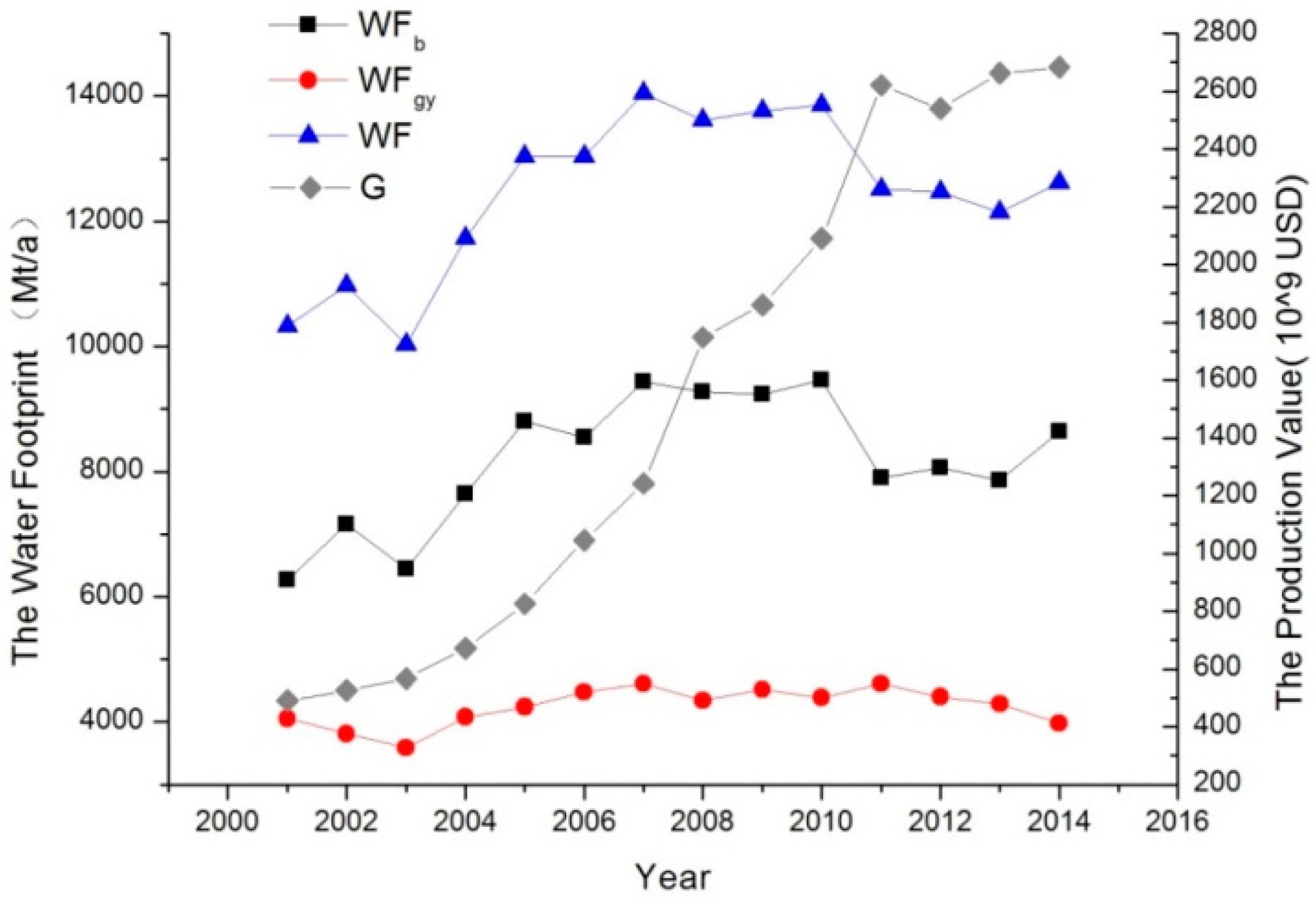 Changes in total output and water footprint (WF) of China’s textile industry (2001–2014). Note: WFb, blue water footprint; WFgy, grey water footprint; G, gross annual industrial output.