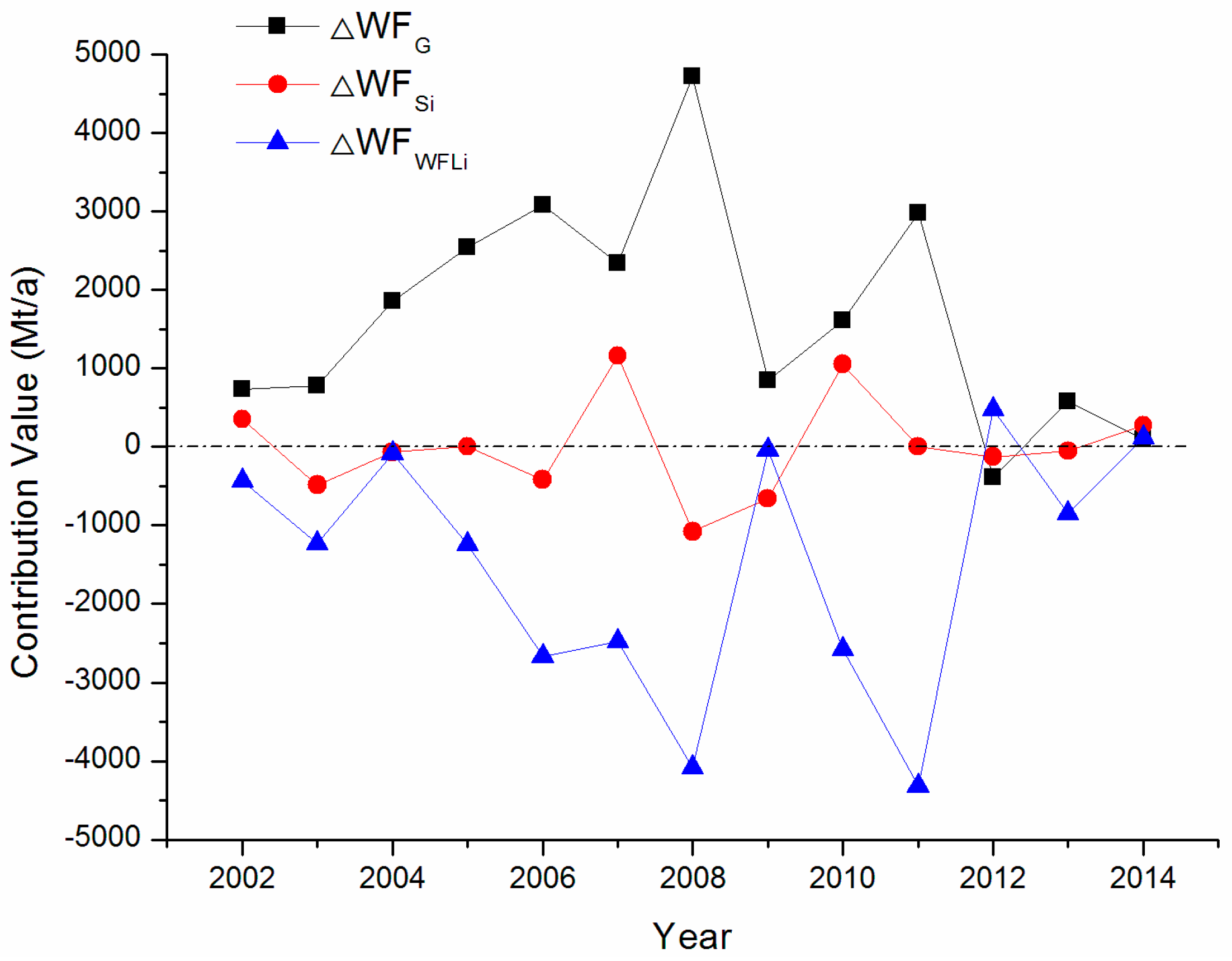 Table 5 and Figure 2 show the results of the decomposition of the WF of China’s textile industry from 2002 to 2014. Industrial scale factor showed the major positive contribution to the textile WF, except for 2012. From 2002 to 2014, the average contribution of industrial scale factors to WF growth was 1674.55 Mt/a, which is higher than the industrial structure factor (−3.06 Mt/a) and the technical level factor (−1494.78 Mt/a). The industrial scale significantly influenced the WF during 2002–2011, with a contribution of 4724.20 Mt/a in 2008, reaching the maximum value in the sample period. As a labor-intensive industry, the textile industry expands the industrial scale through China’s labor-rich and low-cost advantages.