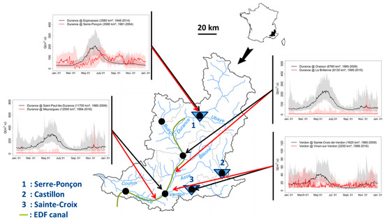 Comparison of natural (black) and observed (red) median annual hydrographs at different locations within the Durance River basin. Shading indicates the interdecile range of the daily river flow. Triangles indicate the location of the main reservoirs. Black dots are the locations of the sub-basins examined within the “Risk, Water Resources and Sustainable Development within the Durance River Basin in 2050” (R2D2-2050) project.