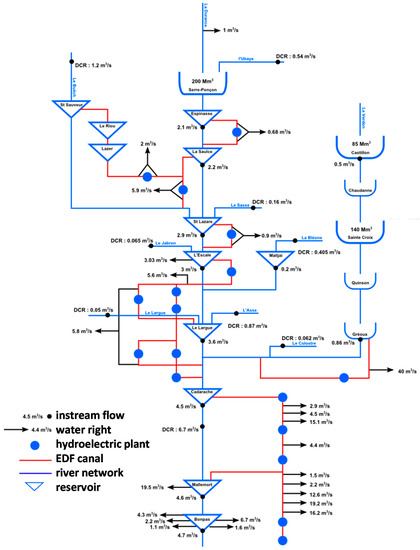 - EDF Délégation de bassin Rhône Méditerranée (EDF). Gestion Estivale de l’Eau—Bassin Rhône Méditerranée; EDF: Lyon, France, 2016; p. 15. [Google Scholar]