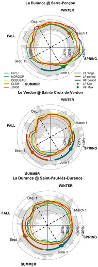 Using the average of the 330 climate projections, the Durance River basin will experience a warmer climate by the 2050s and all the models predict a significant decline in mean annual renewable water resources with an accompanying decrease in summer flow (Figure 3). However, dispersion within hydrological models is perceptible on the graphs, e.g., the CLSM model projects more substantial decrease in summer flows than the other models. This scattering stems from the difference in the evapotranspiration and snow pack components of the selected hydrological models [18]. The sign and the magnitude of the seasonal changes depend on the current river flow regime. Although the models produced different temporal patterns and magnitudes of change, a consistent substantial increase in flows is identified from late winter to mid-spring for basins in the mountainous areas (e.g., more than +20% for the Durance River at Serre-Ponçon). Thus, the headwaters may experience a decrease in snowpack, leading to reduced flows in the spring season and to an earlier timing of snowmelt, as a consequence of the increase in mean air temperature. The tributaries less affected by snow melt processes may face the most significant changes in summer (e.g., around −20% for the Verdon River at Sainte-Croix-de-Verdon). Mean changes obtained for the five hydrological models are values close to the first quartiles observed under current conditions. This result indicates that low flow events more severe than those observed in a recent past could be expected. In addition, results show a rise of both the low-flow severity and the low-flow duration and a decrease in water resources in summer, which corresponds to the peak water demand for irrigation. No significant change in flood severity was found.