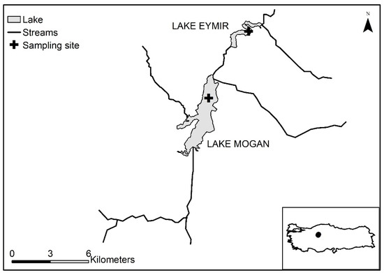 The catchment area of the lakes covers 1010 km2, and 68% of the catchment consists of agricultural land dominated by non-irrigated crops, mostly wheat. Although both lakes and their surroundings mainly fulfill urban housing and recreational needs, the wildlife and biodiversity value of the lakes are high. For instance, the area hosts more than 26 mammal species and 231 bird species, of which 76 are breeding [53,54], as well as the endemic plant species Centuarea tchihatcheffii. Both lakes are designated as “Specially Protected Areas”, and Lake Mogan has been declared an “Important Bird Area” by the Ministry of Environment and Urbanization.