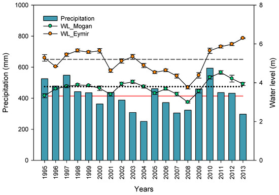 Changes in total annual precipitation and average water levels of Lakes Mogan and Eymir between 1995 and 2013. Red solid line indicates average annual precipitation, black dotted and black dashed lines indicate long term average water levels for Lake Mogan and Lake Eymir, respectively (data source for precipitation: Turkish State Meteorological Service [51]).