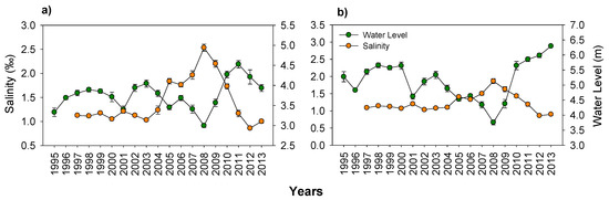 Changes in yearly mean (with ± SE) salinity and water level in (a) Lake Mogan and (b) Lake Eymir. Note the scale differences on the y-axes.