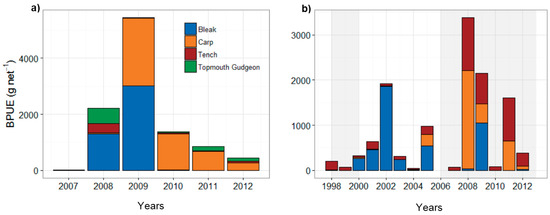 In both lakes, the fish community was composed of carp, bleak (Alburnus alburnus), tench, and pike, as well as invasive species topmouth gudgeon (Pseudorasbora parva) (Figure 4a,b). Highest BPUE (dominated by bleak, carp, and tench) was recorded in 2008–2009 during the LWL period (Figure 4a,b). In Lake Eymir, after the first biomanipulation (1998–1999), BPUE was low; however, it later recovered (Figure 4b) and the increase in bleak biomass following the first fish removal was considerable (Figure 4b). The second biomanipulation (2005–2013) produced a temporary decline in the BPUE of carp, tench, and bleak (Figure 4b). However, there was a considerable increase in BPUE in 2008–2009 when the water level was the lowest. This also coincided with a peak in fish removal, with a total biomass of 18 tons of carp and 7 tons of tench per year removed.