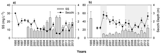 Changes in yearly mean (with ± SE) water transparency (Secchi depth) and concentrations of suspended solids (SS) from 1995 to 2013 for (a) Lake Mogan and (b) Lake Eymir (shaded periods indicate the first and second biomanipulations). Note the scale differences on the y-axes.