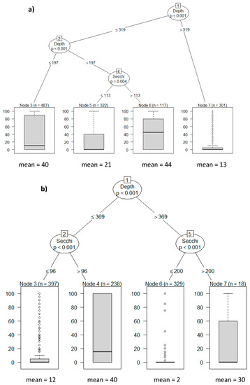 A regression tree was constructed to reveal the relative importance of water level and Secchi depth as potential predictors of a response variable for macrophyte coverage in each lake [86]. In our study, we used conditional inference trees (CIT) [87] where data are recursively partitioned into smaller groups—branches—and binary splits are selected based on maximization of the homogeneity of the two resulting groups. The macrophyte data used in the regression trees covered the period from 2001 to 2013 for both lakes. The party (A Laboratory for Recursive Partitioning) R package [88] was used for analyses.