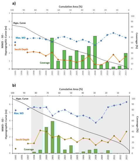 Changes in maximum water depth (MWD), Secchi depth (SD), hypsographic curve and % submerged macrophyte coverage in (a) Lake Mogan and (b) Lake Eymir (shading indicates the first and second biomanipulation).