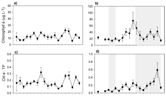 In Lake Mogan, Chl-a concentrations appeared to be lower when macrophytes were present (with the exception of 2011), which may be attributed to competition for nutrients as well as other stabilizing buffer mechanisms of macrophytes [42,95]. In addition to the bottom-up control of phytoplankton, the top-down control of zooplankters could also be important [96] as the zooplankton biomass was largely dominated by copepods, but daphnids were also present. In Lake Mogan, the phytoplankton biomass was also largely dominated by small colony-forming cyanobacteria (Merismopedia sp.) and N-fixing species (Anabaena sp. and Anabaenopsis sp.). During years when the DIN:SRP ratio was low (<13), cyanobacteria contribution to the phytoplankton biomass was important (Figure 6e and Figure 9e) implying cyanobacteria dominance at N-limited conditions [97].