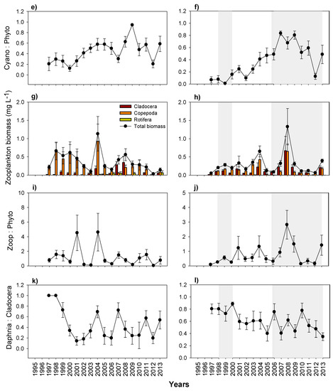 Changes in yearly mean (with ± SE); (a,b) Chlorophyll a; (c,d) Chla:TP (Phytoplankton yield); (e,f) cyanobacteria to total phytoplankton ratio; (g,h) zooplankton biomass; (i,j) zooplankton to phytoplankton ratio; (k,l) Daphnia to Cladocera ratio, in Lake Mogan (left panels) and in Lake Eymir (right panels) (shaded periods indicate the first and second biomanipulation). Note the scale differences on the y-axes.