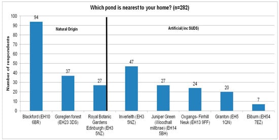 Biodiversity is of high importance when considering the benefits of living within walking distance to a pond. This result is in line with previous studies where biodiversity benefits were of high regard from the public [10,16]. The habitat potential is enhanced where a well-maintained pond is found; for example Juniper Green and Blackford ponds.