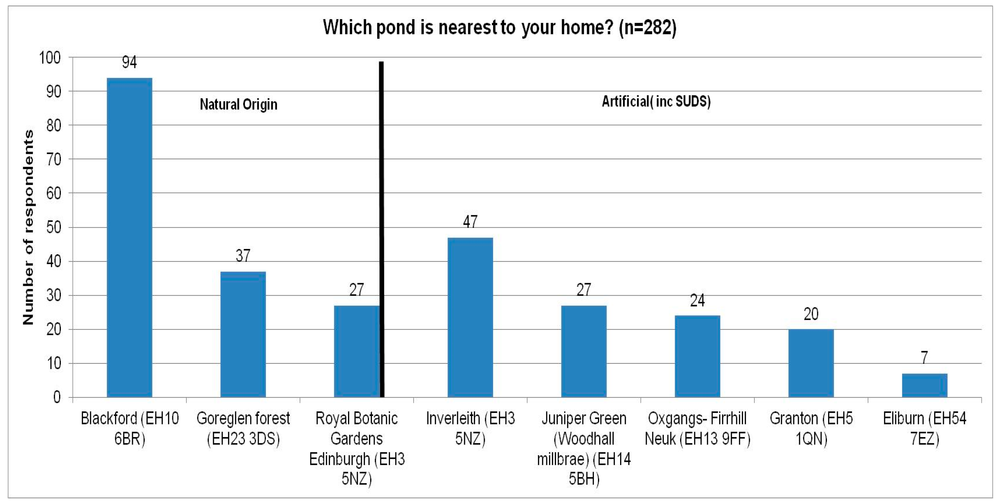 Blackford pond has the highest number of survey responses (n = 94, Figure 1), and more than double the responses of Goreglen (n = 37), which may be due to the attraction of the local nature reserve as the pond has an abundance of water birds and insects in spring and summer. Juniper Green and the Royal Botanic gardens have the same number of responses. Juniper Green has the greatest number of responses from the SUDS ponds chosen, with the least recorded at the Livingston ponds. The responses for some areas are relatively modest in number and, as such, may not produce results which are statistically significant. However, the total number of responses may be sufficient to draw conclusions and support comparisons with other studies.