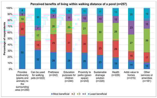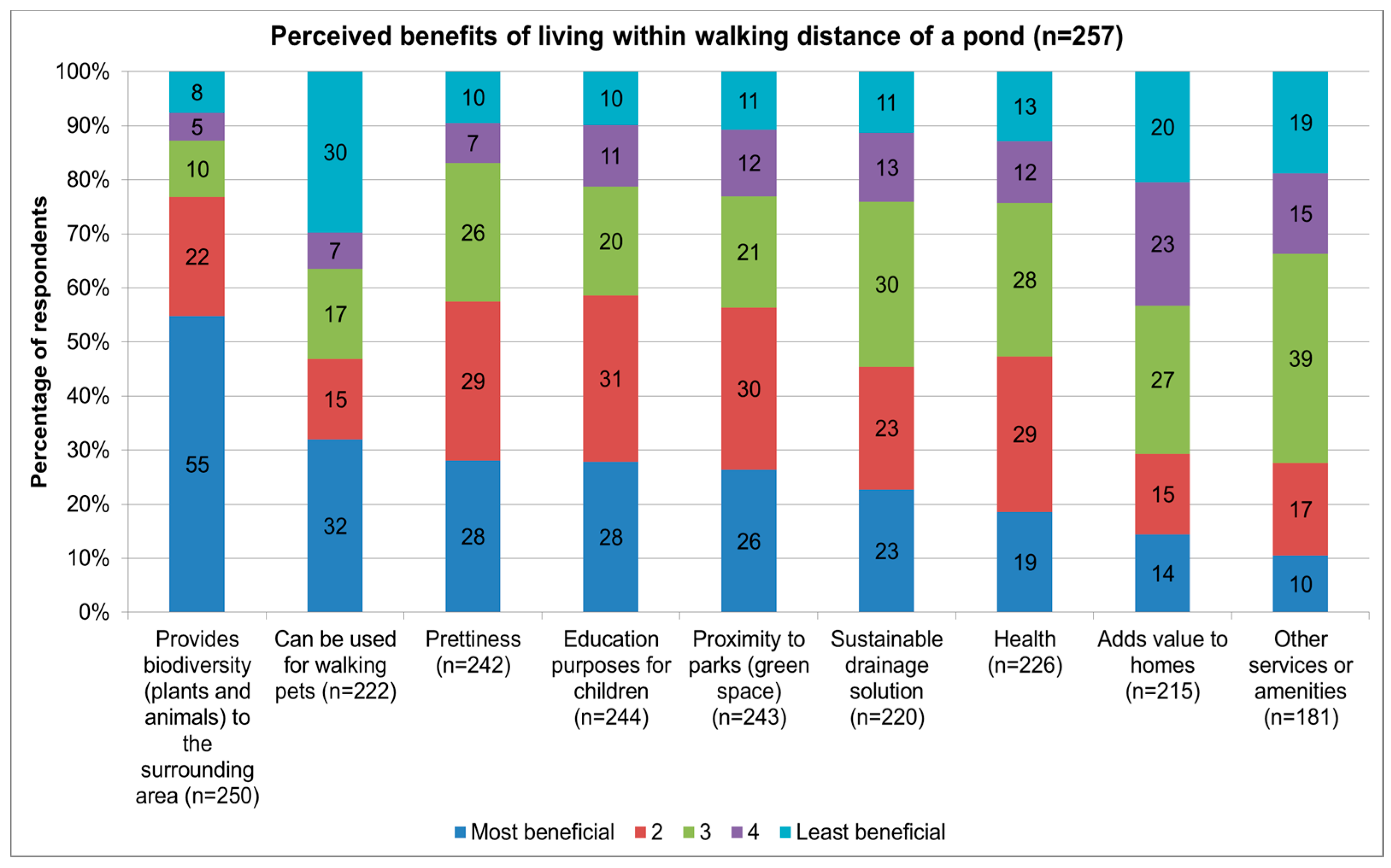 Perceived benefits of living next to a pond (within walking distance), rated 1: Greatest benefit to 5: Least benefit.
