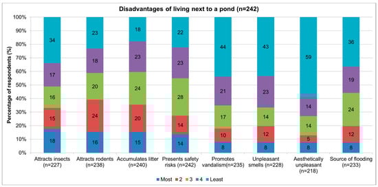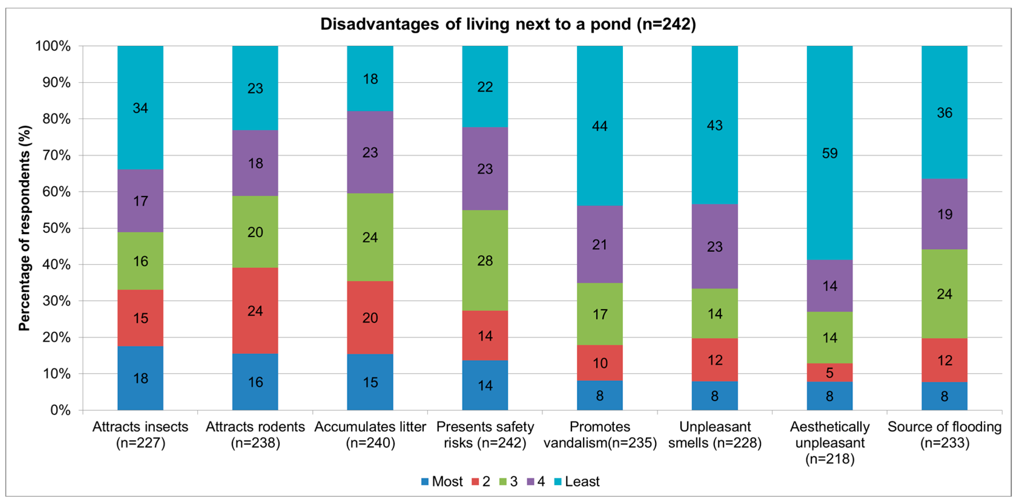 The perceived disadvantages (Figure 4) of living within a short walking distance from a pond include, attracts insects, with 18% of respondents viewing this as more of a disadvantage than rodents (16%). Safety risks were viewed as a similar disadvantage (14%) as that associated with litter (15%).