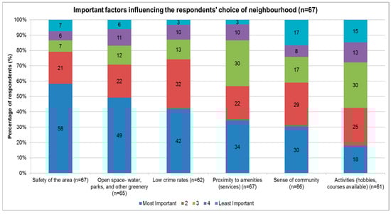 Safety of the area is the most important factor when choosing a neighbourhood to live, especially for those with families (Figure 5, n = 67). Open space is another factor with high importance, which relates to the importance of SUDS greenery and, providing safe, open, spaces for children to play in. Low crime rates are another important factor which is re-emphasised by high levels of crime being the second highest perceived danger (Figure 6).