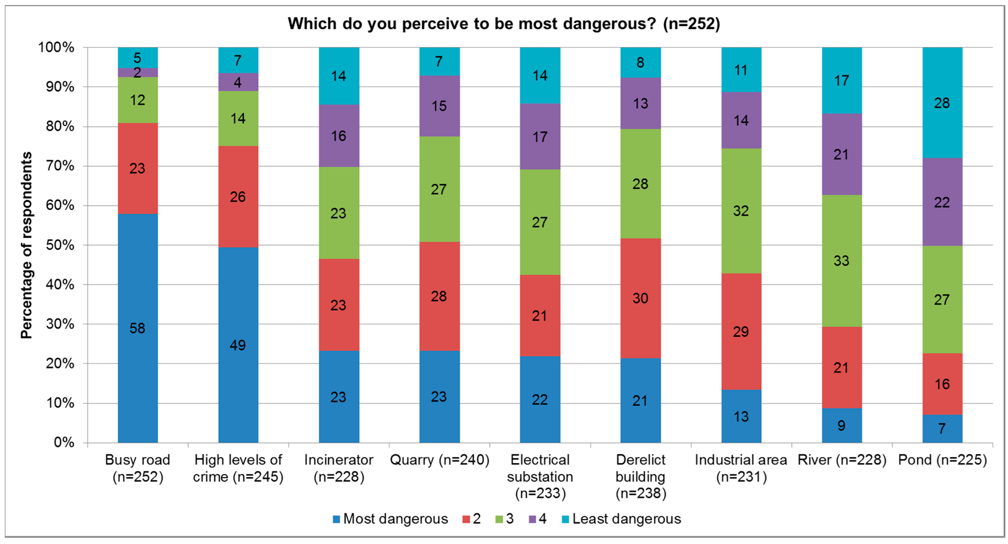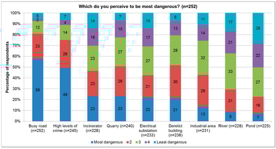 The lowest perceived dangers in both modes of survey were ponds and rivers, with each having less than 10% of first preferences. Busy roads were the highest perceived danger, with 58% of the sample population having significant concerns about busy roads, which also relates to the importance of safety in a neighbourhood and having park environments with open spaces nearby [16].