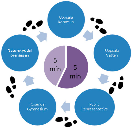Speed-dating carousel. Uppsala Kommun: local authority; Uppsala Vatten: drinking water company; Rosendal Gymansium: school; and Naturskyddsföreningen: nature conservation NGO.
