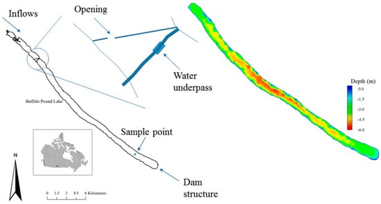 Buffalo Pound Lake, Saskatchewan, Canada. Mean depth is 3.8 m with a maximum depth of 5.98 m. Mean residence time is highly variable (6 to 30 months). Flow is in a southeast direction. The black reservoir outline is to the provided scale. The digital elevation model (DEM) shows bathymetry for the main body of the lake downstream of the underpass.