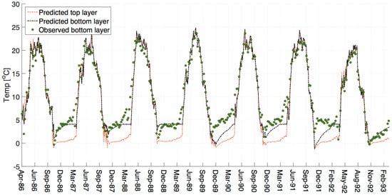Another point to consider is that oxygen consumption rates are shown to be temperature dependent with lower consumption rates at lower temperatures [12]. Both the summer temperatures of 1992 and winter temperatures of 1992/93 were colder than previous years. This suggests that less heat may be stored in the sediments. The sediment temperature in W2 is a fixed user parameter, and in our model has been set at the average annual air temperature over the simulation period (where temperature >0 °C). The observed sediment temperature may be colder than this average value in the final winter, and, in reality, the sediment oxygen requirements are lower than we are modelling.