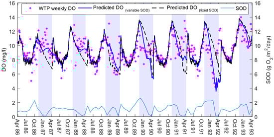 The dissolved oxygen (DO) model using variable sediment oxygen demand (SOD) rates found through a semi-automated calibration procedure to match weekly predicted and observed DO concentrations (WTP weekly DO). These SOD rates are maximum values, as used by CE-QUAL-W2. The black line represents the best fit we could achieve by Monte Carlo analyses using a constant SOD rate (root mean square error = 1.94 (to 2 dp); mean absolute error = 1.43 (to 2 dp). Ice-cover days shown here in blue stripes are observed data from the Buffalo Pound Water Treatment Plant. Predicted DO concentrations using the variable SOD have root mean square error = 1.58 (to 2 dp); mean absolute error = 1.1 (to 2 dp).
