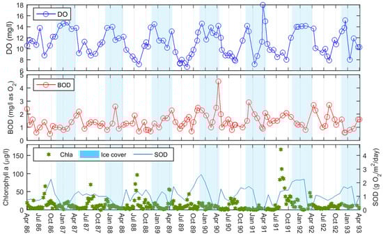 Low winter DO concentrations have been linked to shallower lakes with sizeable littoral zones and prolonged ice-cover [17]. Shallow waterbodies have a large sediment–water interface relative to water volume. This interface is where the organic matter and bacterial activity tends to be concentrated [17]. The relative influence of bottom decomposition on the water column is therefore greater in shallow systems [11]. While open waters are often well-mixed from wind action, under ice-cover the shallow water depth means that the anoxic zone could potentially thicken along the bottom sediments. SOD is highly sensitive to small temperature fluctuations at lower water temperatures, with small increases intensifying oxygen depletion [18]. When modelling DO in a shallow, eutrophic system the ability to simulate SOD and the rate of SOD decay is important.