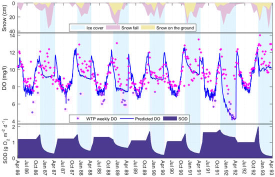 The final DO model shows good overall results (Figure 5). The predicted DO observations follow the pattern of the observed DO measurements in most years. There is some underestimation in the winters of 1986/87, 1987/88 and 1992/93. SOD follows a similar trend for each year with an end-of-season peak, and winter decay. The SOD remains high in the winter of 1991/92 due to a greater than average oxygen depletion that year. There is a clear connection in the model between the predicted DO, and the observed ice-on and ice-off dates provided by the WTP.
